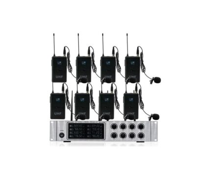 Επαγγελματικό σετ 8Χ ασύρματων δυναμικών μικροφώνων VHF. Το σετ περιλαμβάνει κονσόλα-δέκτη 8 καναλιών για εύκολο συγχρονισμό και ρύθμιση των μικροφώνων.