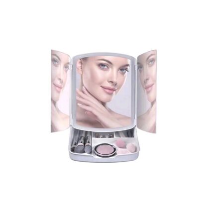 Καθρέφτης μακιγιάζ με πλαϊνούς καθρέφτες που ανοίγουν με πορτάκια και βάση οργάνωσης και αποθήκευσης καλλυντικών και κοσμημάτων.